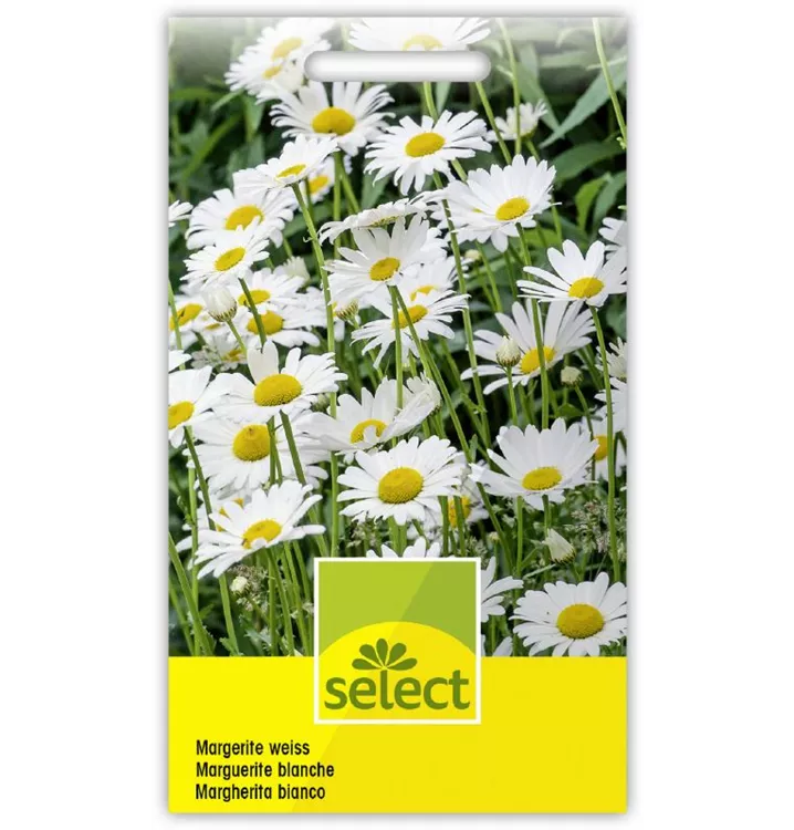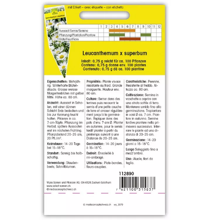 Mehrjährig. Winterharte Blütenstaude. Grosse weisse Margeritenblüten mit gelber Mitte. Höhe ca. 80 cm.