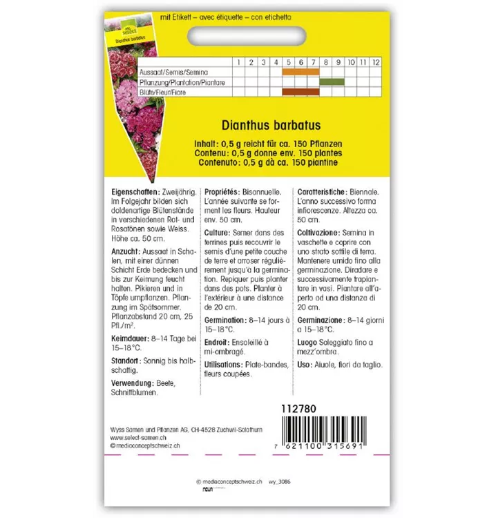 Zweijährig. Im Folgejahr bilden sich doldenartige Blütenstände in verschiedenen Rot- und Rosatönen sowie Weiss. Höhe ca. 50 cm.