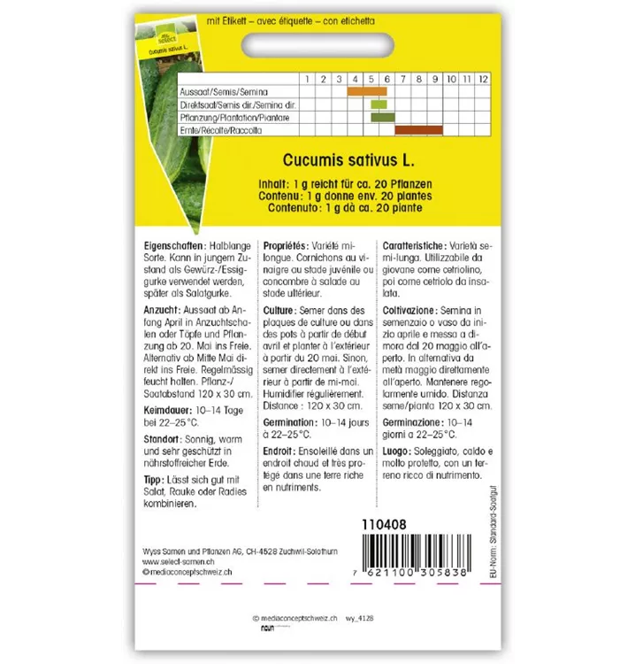 Halblange Sorte. Kann in jungem Zustand als Gewürz-/Essiggurke verwendet werden, später als Salatgurke.