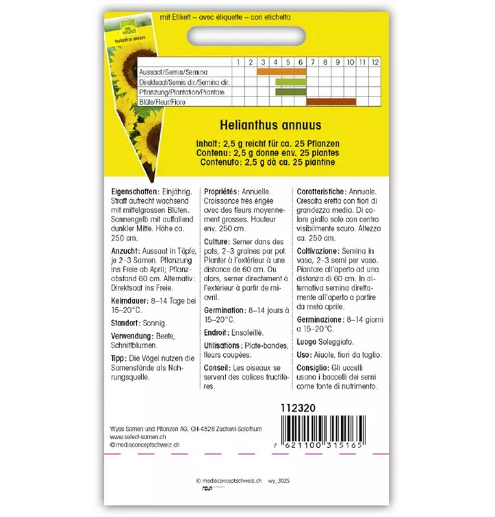 Einjährig. Straff aufrecht wachsend mit mittelgrossen Blüten. Sonnengelb mit auffallend dunkler Mitte. Höhe ca. 250 cm.