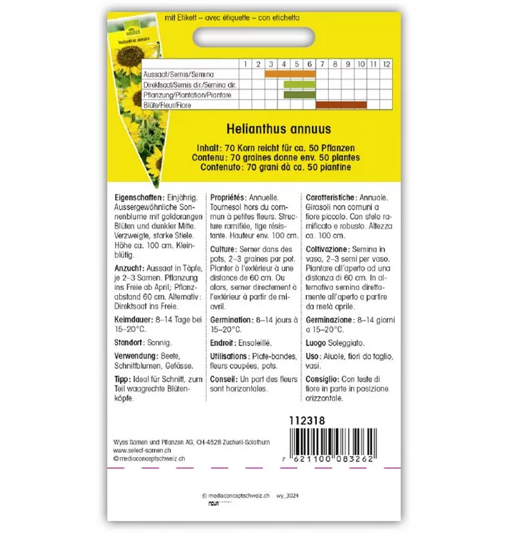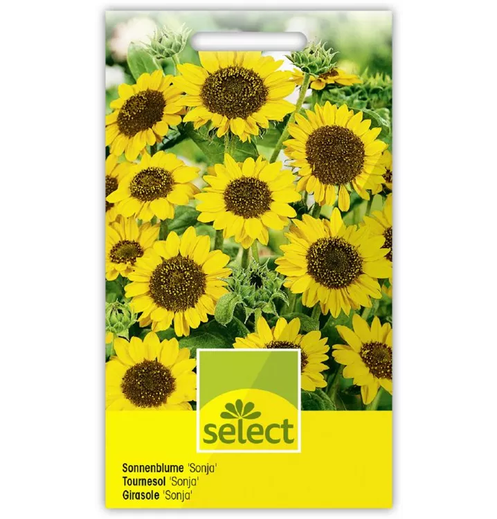 Einjährig. Aussergewöhnliche Sonnenblume mit goldorangen Blüten und dunkler Mitte. Verzweigte, starke Stiele. Höhe ca. 100 cm. Kleinblütig.