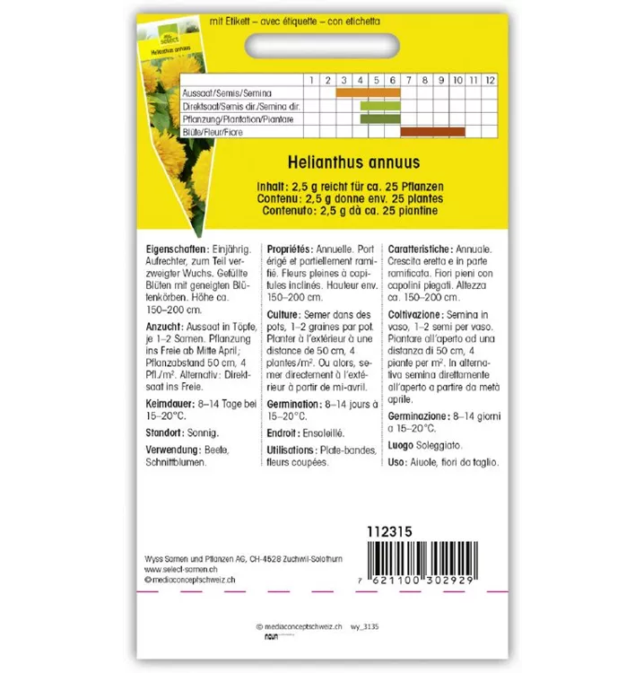 Einjährig. Aufrechter, zum Teil verzweigter Wuchs. Gefüllte Blüten mit geneigten Blütenkörben. Höhe ca. 150-200 cm.