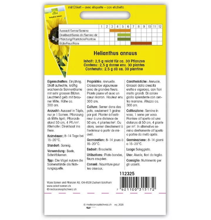 Einjährig. Straff aufrechte, kräftig wachsende Sonnenblume mit sehr grossen Blüten. Leuchtend gelb mit brauner Mitte. Höhe ca. 300 cm.