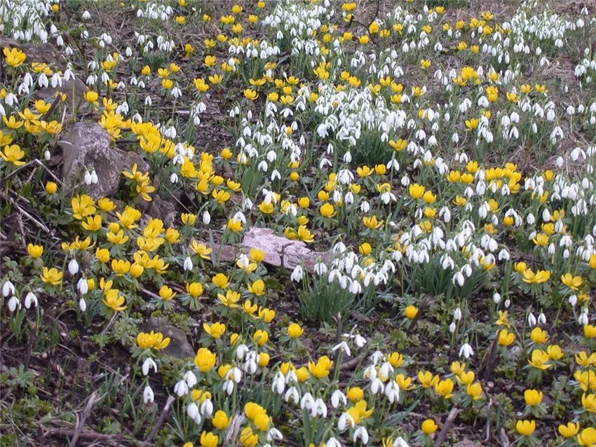 Am weitesten verbreitet ist der heimische Winterling (Eranthis hyemalis). Er stammt ursprünglich aus dem Süden Europas. Dort wächst er in Laubwäldern, Gebüschen und Weinbergen. Hierzulande wird der Winterling bereits seit 4 Jahrhunderten kultiviert. Er ist anspruchslos und pflegeleicht, das macht ihn zu einem beliebten Gartenbewohner. Ganz ohne Mühen können Sie mit Winterlingen große Farbflächen in Ihren Garten zaubern. Und diese kommen schon früh aus dem Boden. Bei Temperaturen knapp über dem Gefrierpunkt treiben Winterlinge aus und zeigen sich bald in ihrer vollen Pracht. Diese präsentiert sich mit 5 bis 15 Zentimetern Wuchshöhe und 2,5 Zentimeter großen Blüten. Trotz ihrer geringen Größe fallen Winterlinge ins Auge, weil sie dem Betrachter sonnengelb entgegenstrahlen. Die Blätter sitzen direkt unter der Blüte und hängen dort palmartig hinab. Sie wirken wie das gespiegelte Ebenbild der Blüte in saftigem Grün.