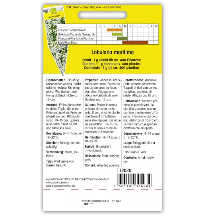 Einjährig. Kriechender Wuchs. Bildet schöne, weisse Blütenteppiche. Wunderbar nach Honig duftend. Höhe ca. 15 cm.
