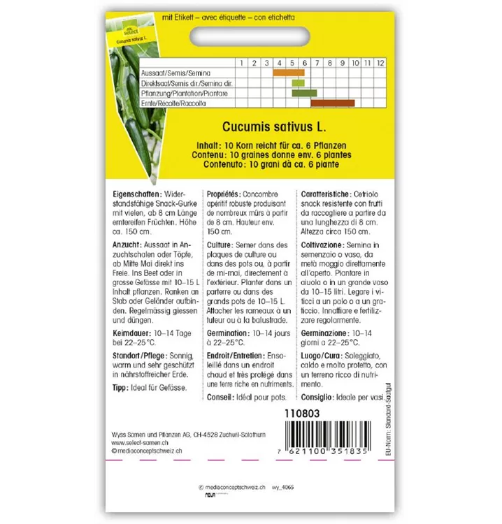 Widerstandsfähige Snack-Gurke mit vielen, ab 8 cm Länge, erntereifen Früchten. Höhe ca. 150 cm.