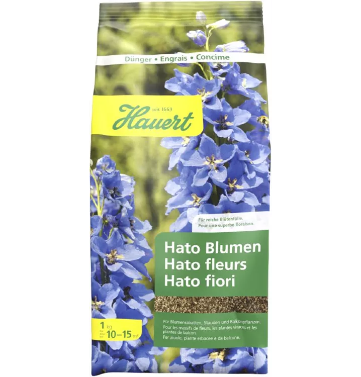 Hato Blumen, der organische Spezialdünger von Hauert, ist die ideale Nährstoffkombination für alle Balkonpflanzen, Zweijahresblüher, Sommerblumen und Blütenstauden.