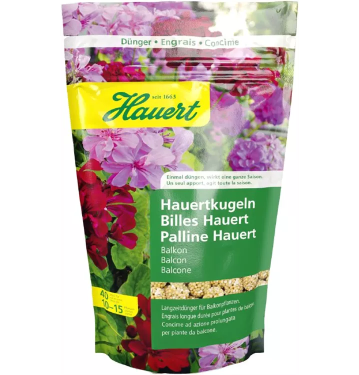 Hauertkugeln ernähren Ihre Balkonpflanzen bedarfsgerecht während der ganzen Saison mit allen nötigen Nährstoffen, ohne Nachdüngung. Das spezielle Langzeit-Nährstoffdepot wirkt gleichmässig, effektiv und langanhaltend: Indem Wasser durch die Aussenmembran in die Kugel dringt, werden infolge des Überdrucks hochwertige Nährstoffe und ein hochaktiver Mix von Spurenelementen frei- und nach und nach an die Pflanze abgegeben.