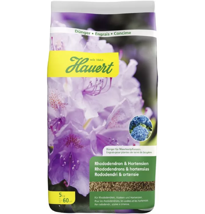 Hauert Rhododendrondünger ist ein hochwertiger, granulierter, organisch-mineralischer Spezialdünger mit 3-fach Wirkung. Startwirkung: Durch die mineralischen Komponenten werden Rhododendren, Hortensien und Azaleen zu kräftigem Wachstum angeregt. Langzeitwirkung und Bodenverbesserung: Die wertvollen organischen Substanzen sorgen für eine lang anhaltende Blütenpracht, wirken humusbildend und bodenverbessernd und fördern so eine gesunde und kräftige Pflanzenentwicklung. Durch das einzigartige Sphero-Granulat ist Hauert Rhododendrondünger leicht und staubfrei auszubringen. Die enthaltenen Nährstoffe weisen eine hohe Pflanzenverfügbarkeit auf. Die Sphero-Technologie ermöglicht eine bisher noch nie erreichte Gleichmässigkeit in der Nährstoffversorgung. Jede Pflanze wird gleich gut mit allen wichtigen Nährstoffen versorgt. Hauert Rhododendrondünger ist kalkfrei und wirkt physiologisch sauer.