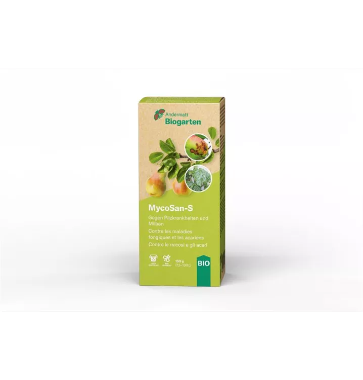 MycoSan-S ist ein biologisches Mittel auf Basis von Schwefel und wirksam gegen zahlreiche Pilzkrankheiten und Milben. Es wirkt vorbeugend gegen Schorf, Echten Mehltau, Schrotschuss an Obst, Beeren, Gemüse und Zierpflanzen sowie gegen Reben- und Birnenpockenmilben, Kräuselmilben, Himbeer- und Brombeergallmilben, sowie Rostmilben an Reben, Beeren und Obst.