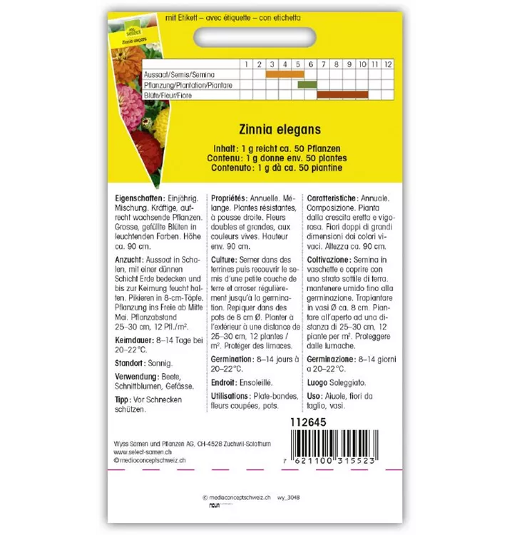 Einjährig. Mischung. Kräftige, aufrecht wachsende Pflanzen. Grosse, gefüllte Blüten in leuchtenden Farben. Höhe ca. 90 cm.