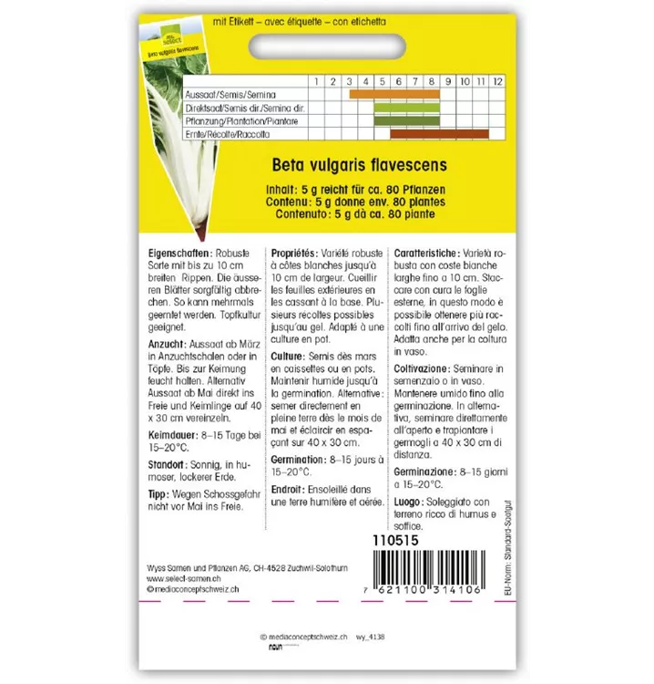 Robuste Sorte mit bis zu 10 cm breiten Rippen. Die äusseren Blätter sorgfältig abbrechen. So kann mehrmals geerntet werden. Topfkultur geeignet.