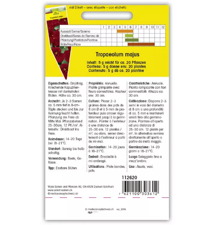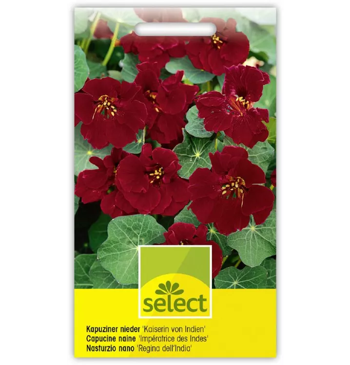Einjährig. Kriechende Kapuzinerkresse mit dunkelroten Blüten. Höhe ca. 30 cm.
