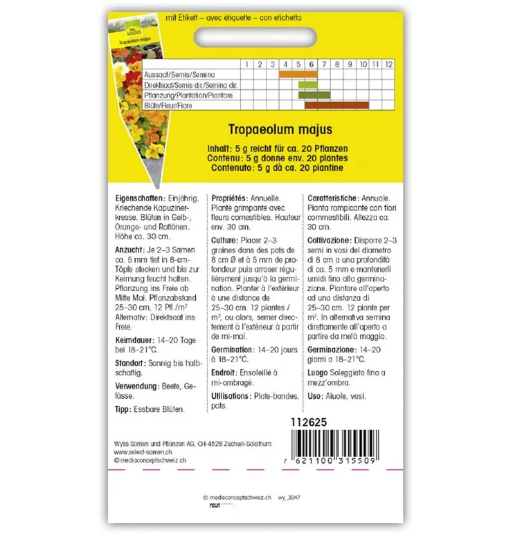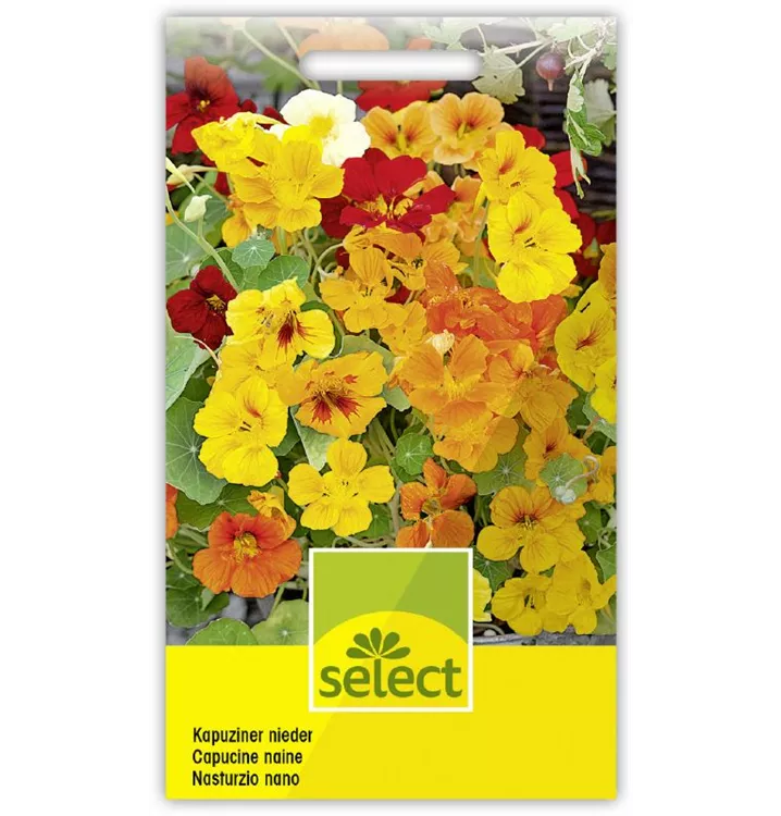 Einjährig. Kriechende Kapuzinerkresse. Blüten in Gelb-, Orange- und Rottönen. Höhe ca. 30 cm.